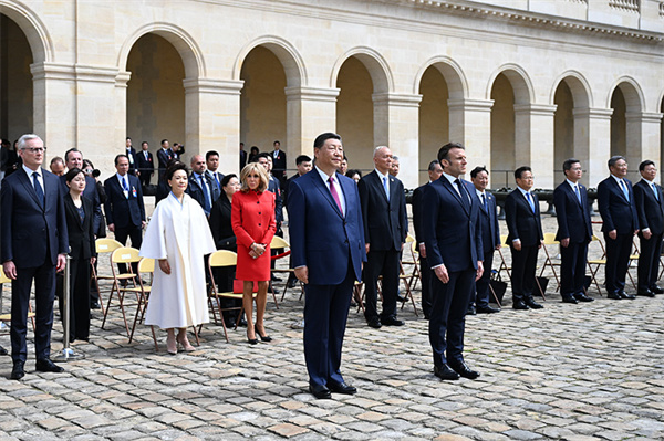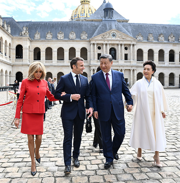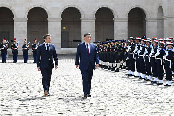 习近平和夫人彭丽媛乘车抵达时,马克龙和夫人布丽吉特在下车处热情迎接。在雄壮的进行曲中,两国元首步入广场。军乐团奏中法两国国歌。两国元首检阅法兰西共和国卫队和陆海空三军仪仗队,并观看分列式。随后,习近平和彭丽媛同法方主要官员一一握手致意。马克龙夫妇同中方陪同人员分别握手致意。